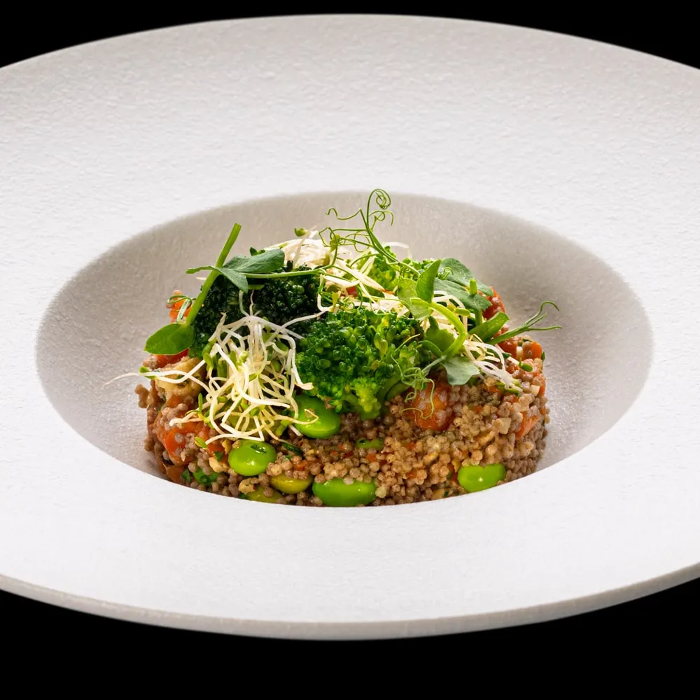 Piatto vegano con elevato valore biologico delle proteine, ricco in fibre e vitamine; arricchito da una varietà di verdure che apportano benefici e una sensazione di sazietà.