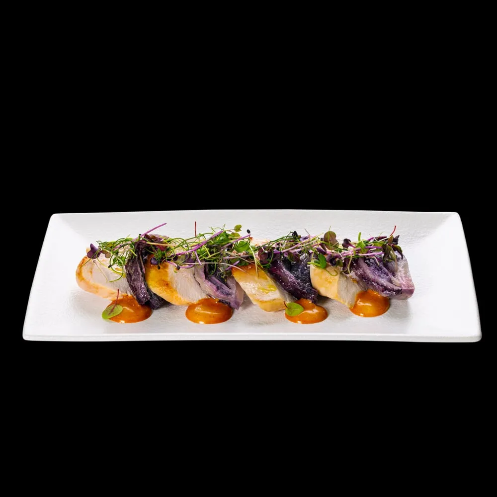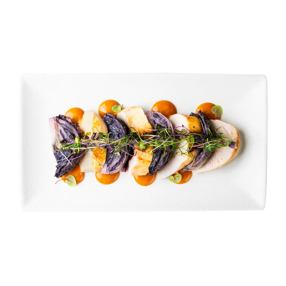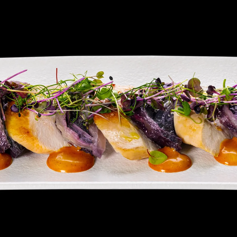 Pollo avvolto da una crema di salsa thaina dal sapore dolce grazie alla presenza del miele, accompagnato da foglie di radicchio.